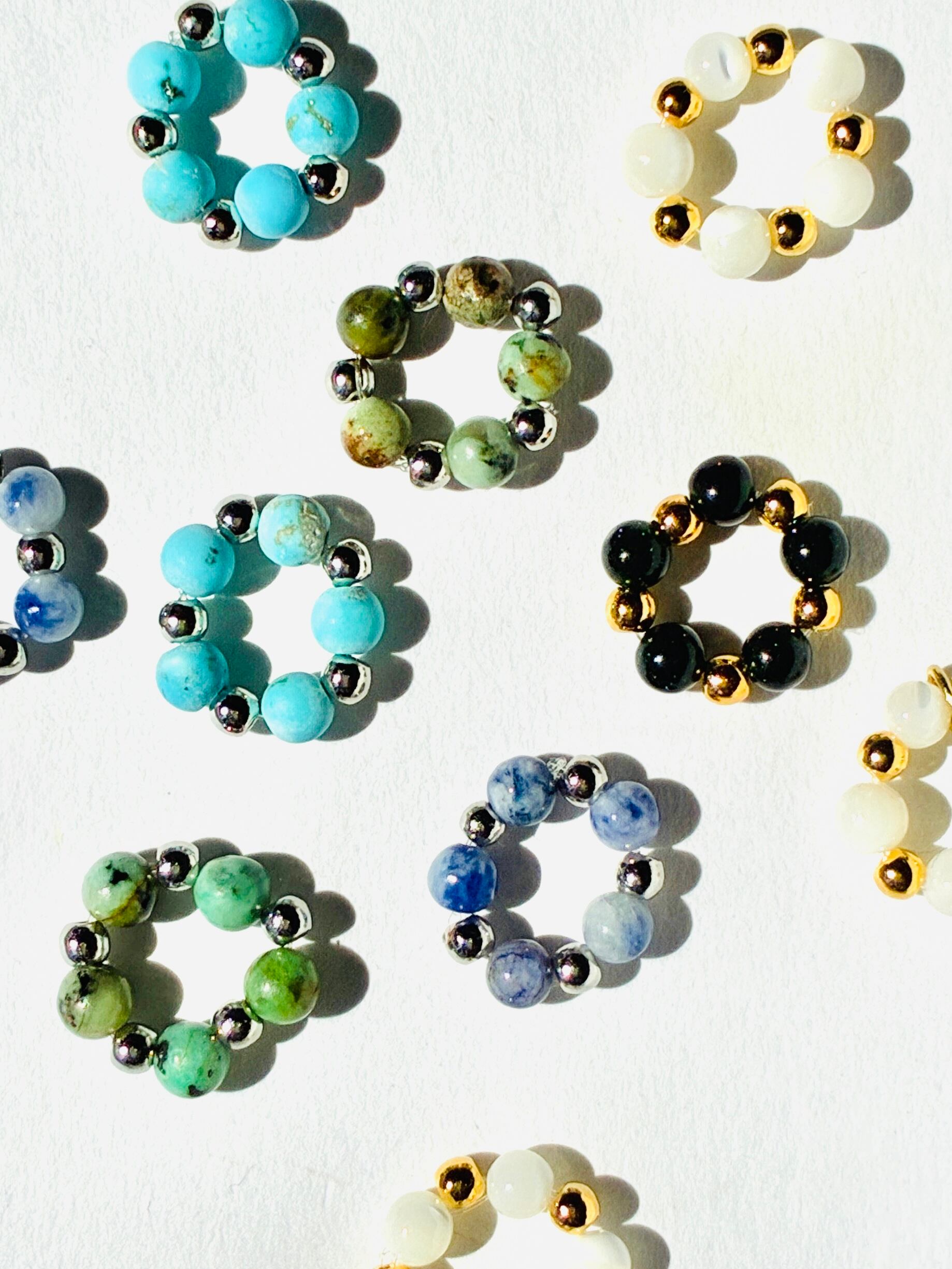 丸い天然石を集めて小さな輪を紡ぎました。