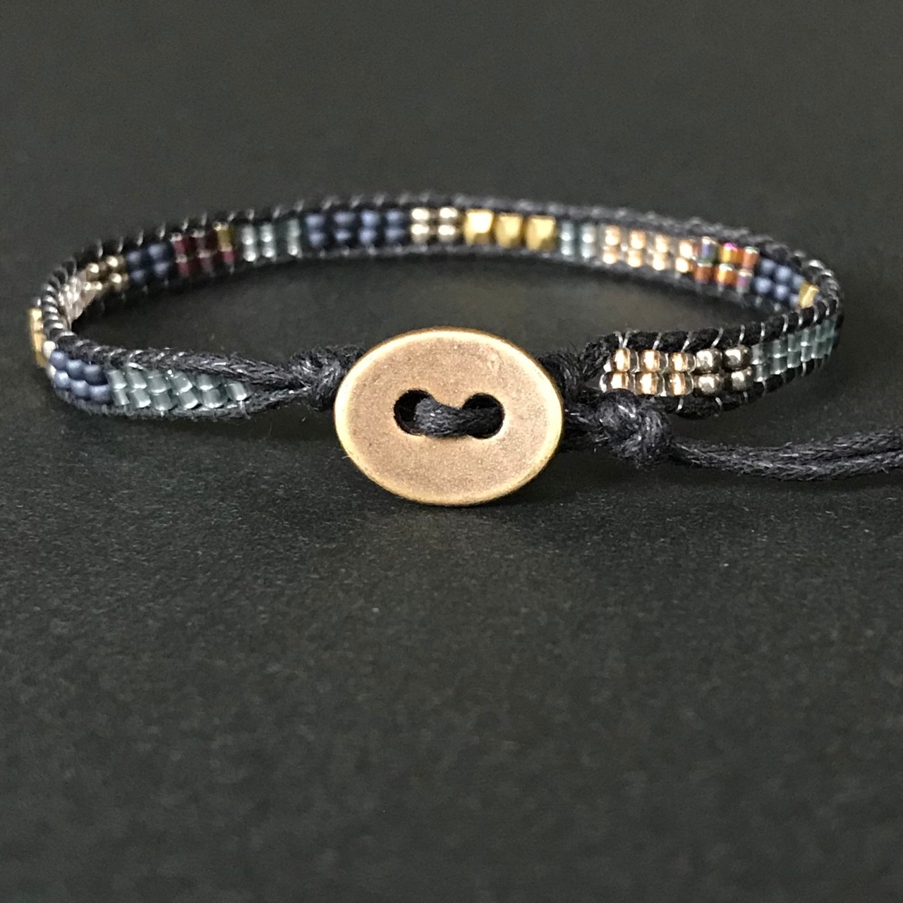 燻したゴールドとマットな黒のラップブレスです。大人感たっぷりなアンティークカラーは渋くて格好いい。長さ調整が3段階で可能ですのでメンズのブレスレットとしてもオススメです。(3枚目写真はメンズ着用イメージです)
