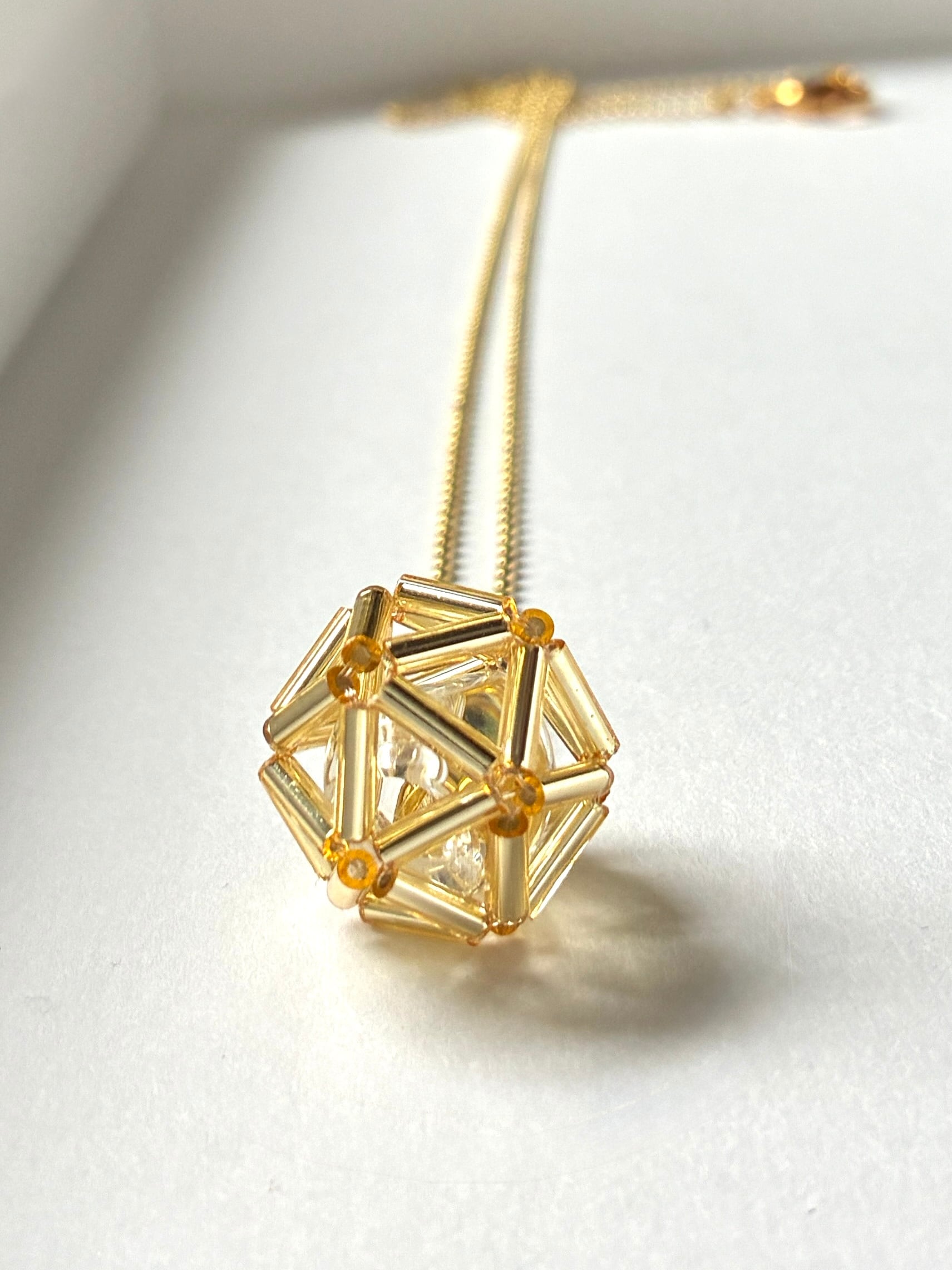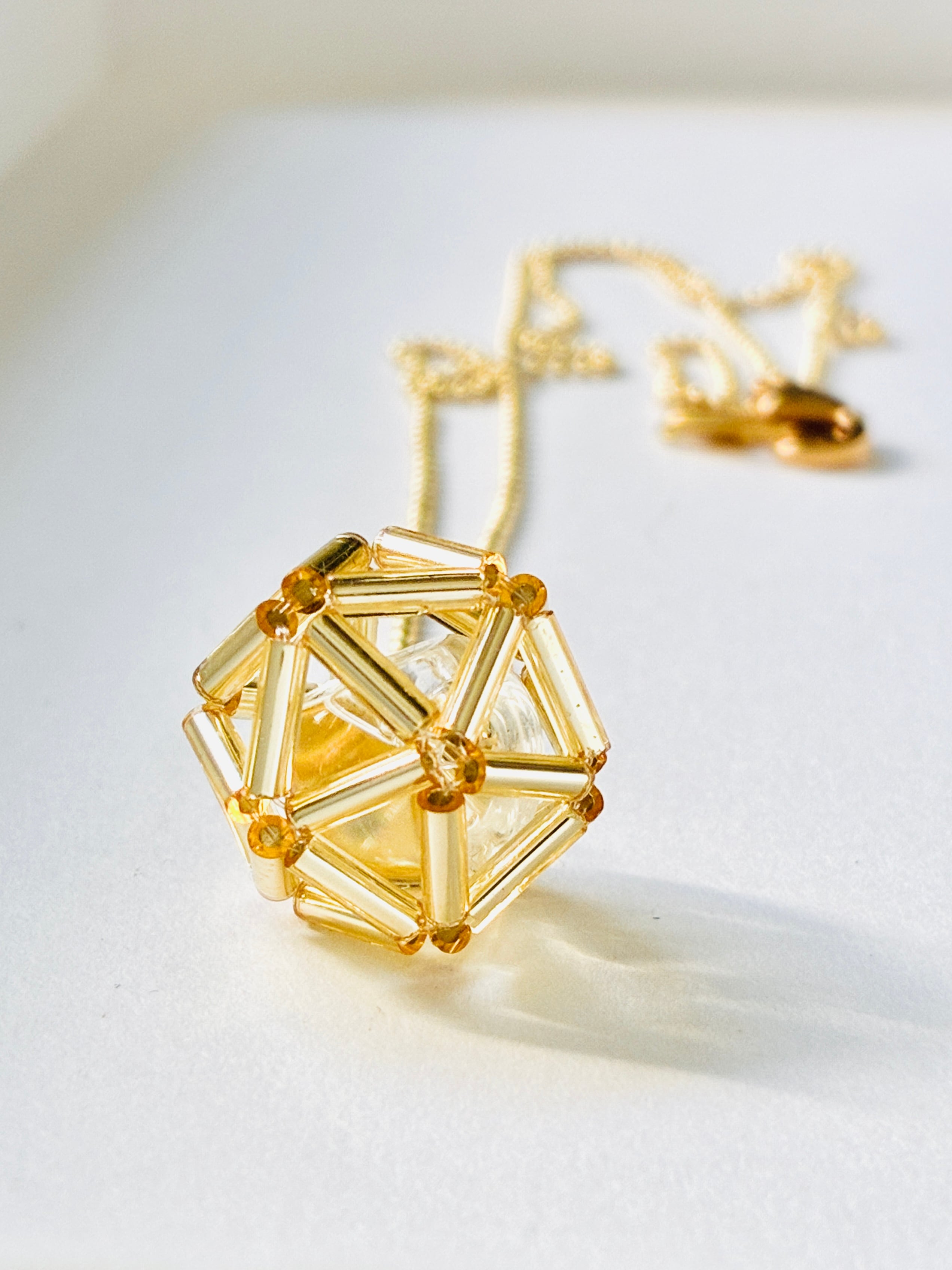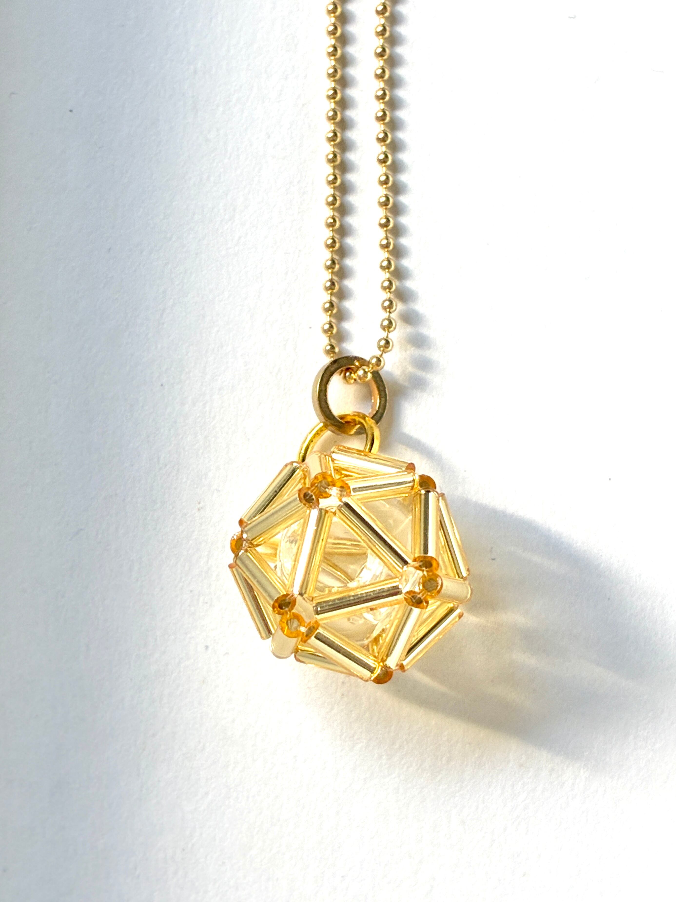 小さな三角形が20個集合した「正20面体(イコサヒードラル)」。ガラスビーズで丁寧に編み上げ、幾何学的な美しさとクールさを合わせ持つ仕上がりになりました。