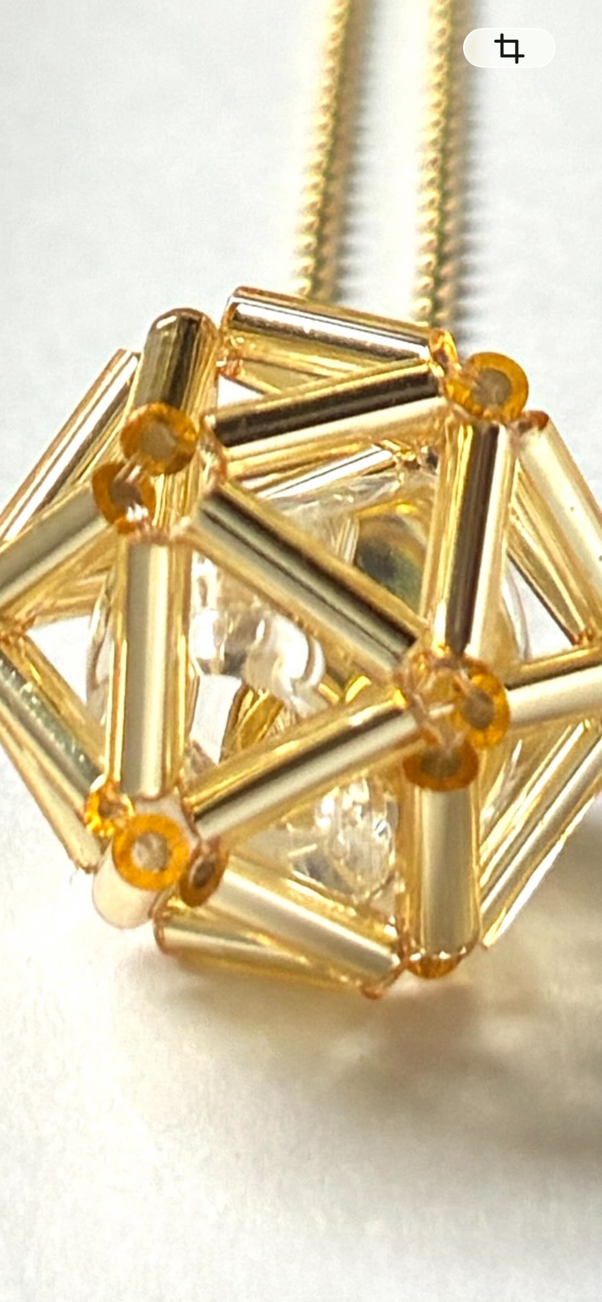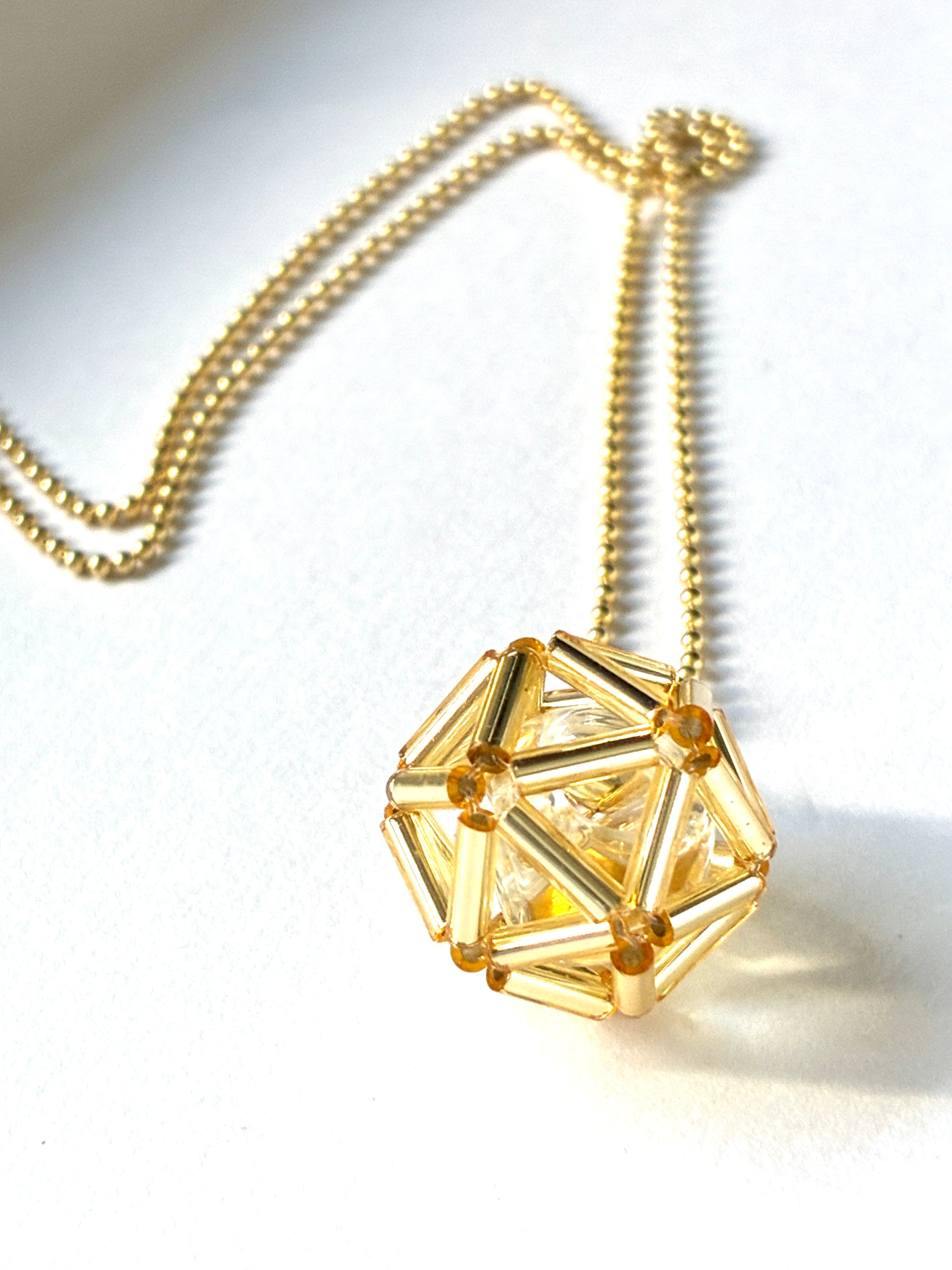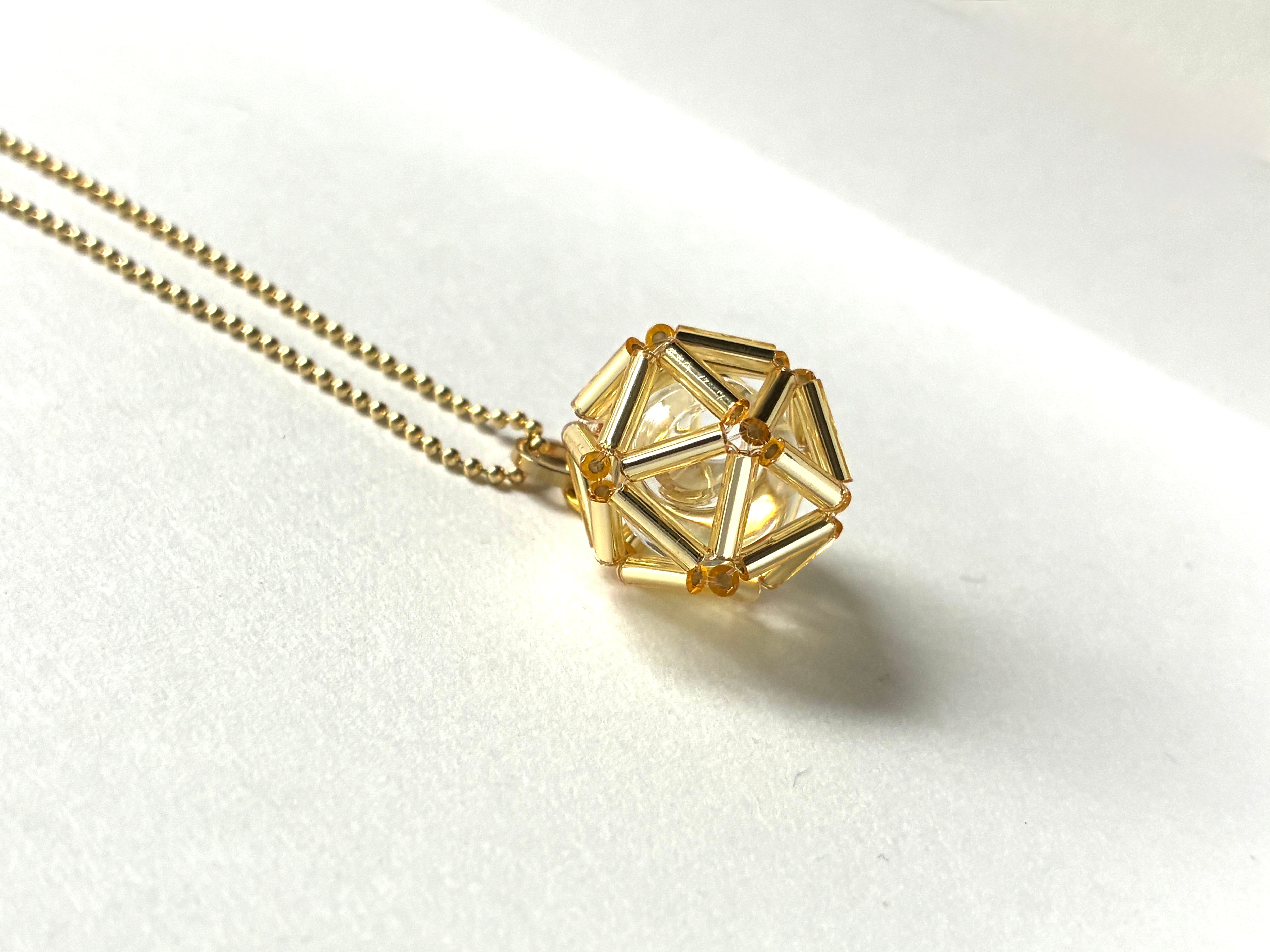 小さな三角形が20個集合した「正20面体(イコサヒードラル)」。ガラスビーズで丁寧に編み上げ、幾何学的な美しさとクールさを合わせ持つ仕上がりになりました。