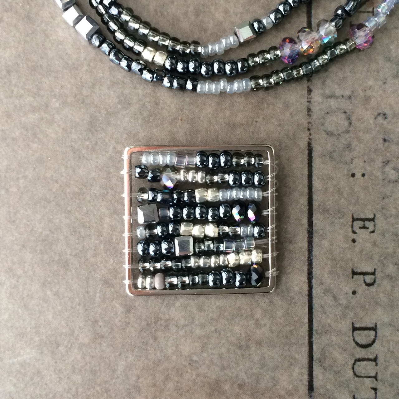 黒とシルバーのシャープなメタルの輝きが印象的な渋いスクエアチャーム。様々なビーズの不規則な並びに遊び心を感じます。同じビーズを使用したネックレスとセットでお使い頂くとさらに素敵。お手持ちのネックレスのペンダントトップしてもお使いいただけます。(写真のネックレスは商品に含まれません。)