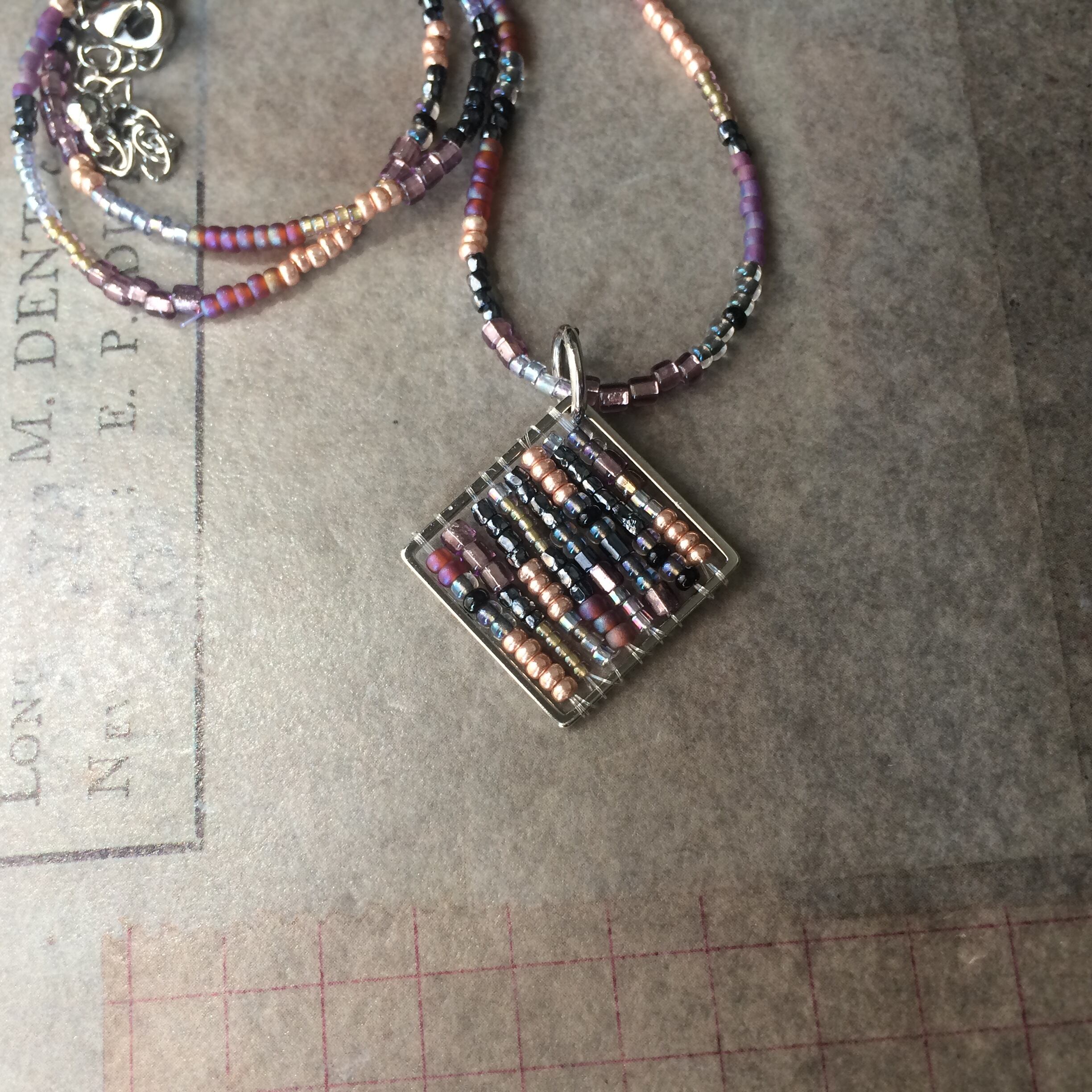 深みのあるワインを思わせるような色使いが大人の雰囲気のスクエアチャーム。様々なビーズの不規則な並びに遊び心を感じます。同じビーズを使用したネックレスとセットでお使い頂くとさらに素敵。お手持ちのネックレスのペンダントトップしてもお使いいただけます。(写真のネックレスは商品に含まれません。)
