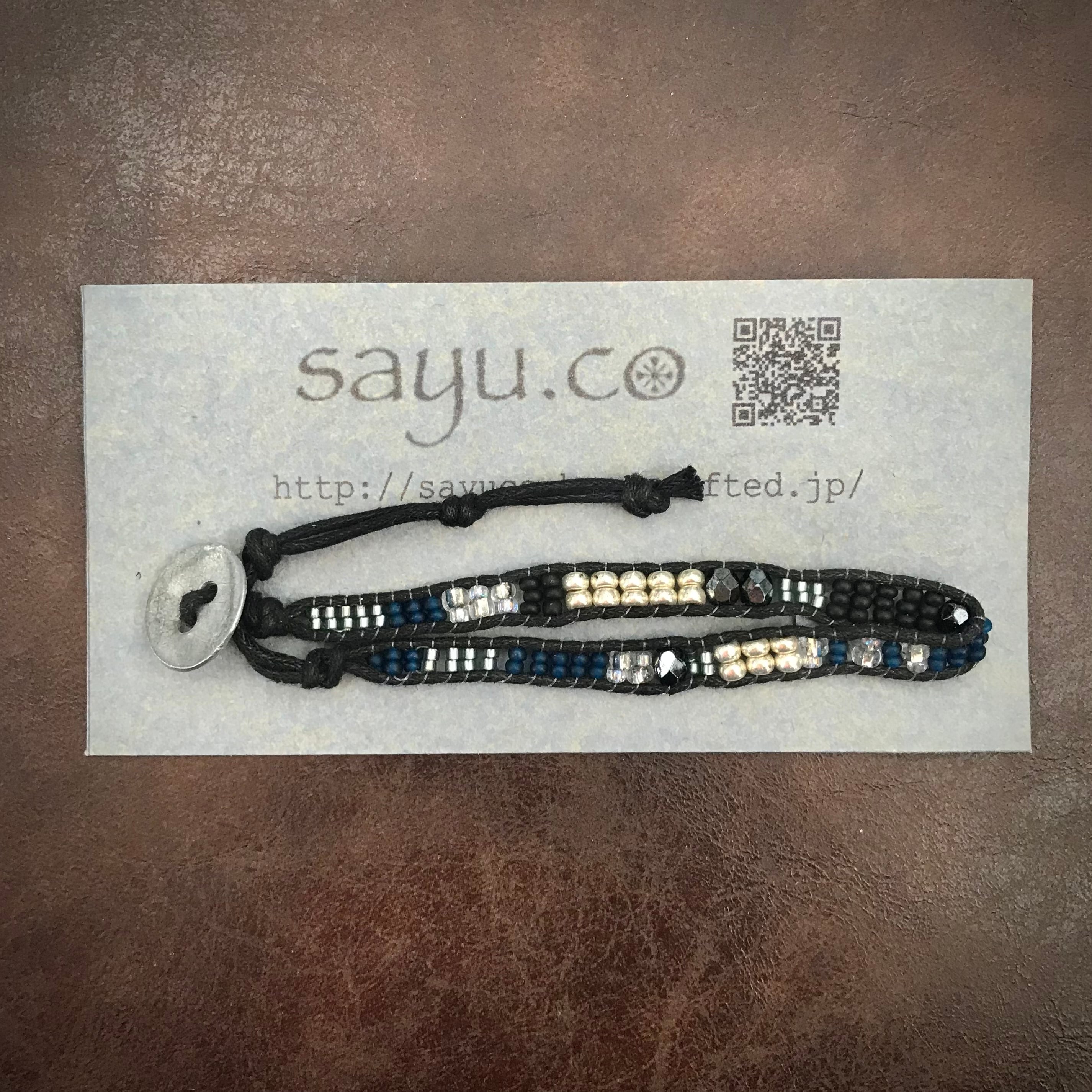 ブラックのワックスコードに、パールの様な輝きを放つ美しいビーズやクリスタルカラー、マットブルー、マットブラックなど、数種類の様々なビーズを散りばめています。ダークな中にも優しさを秘めた仕上がりになりました。