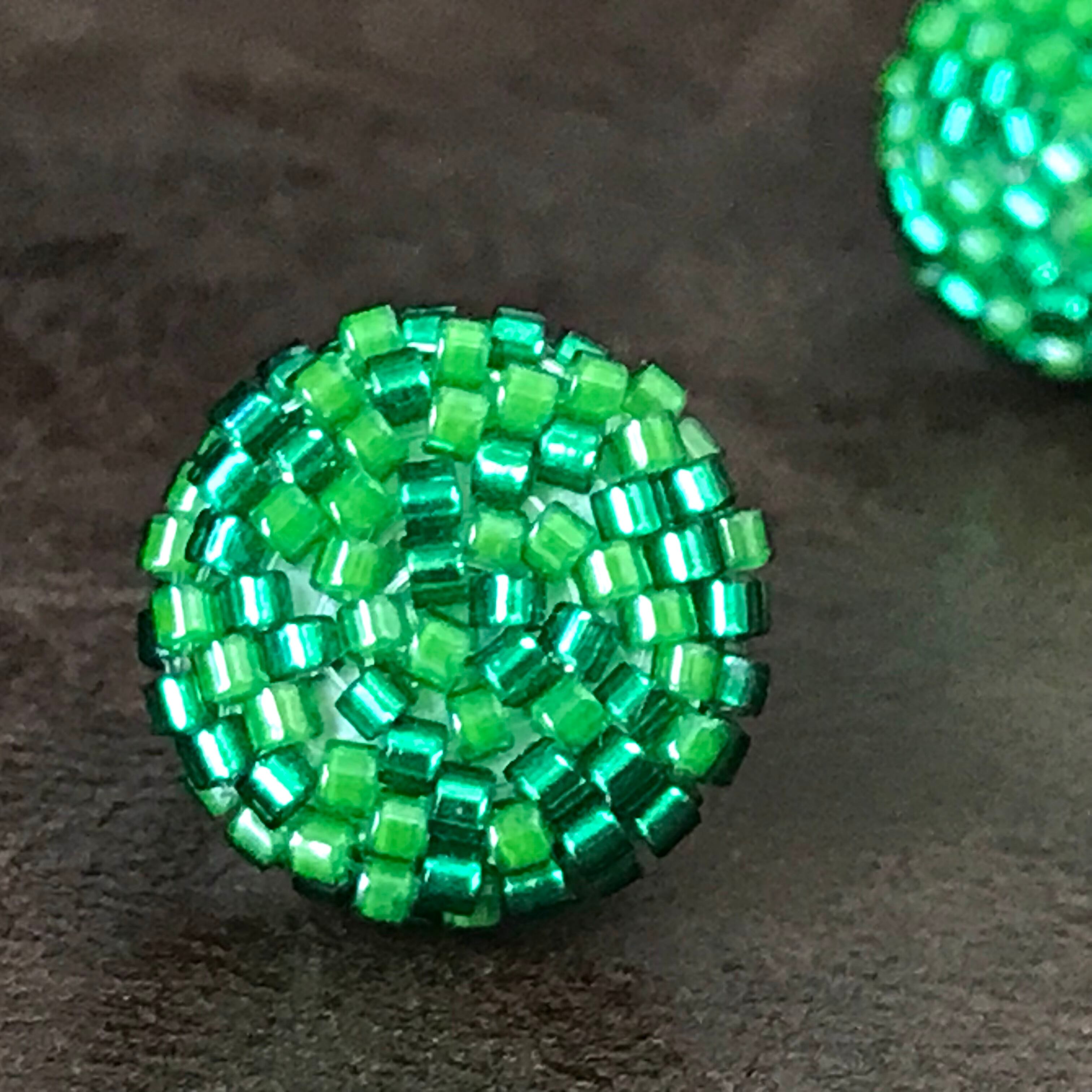 種のように小さなガラスの日本製シードビーズを贅沢に使い、ボタンを包み込むように丁寧に編み上げたマカロンイヤリングです。