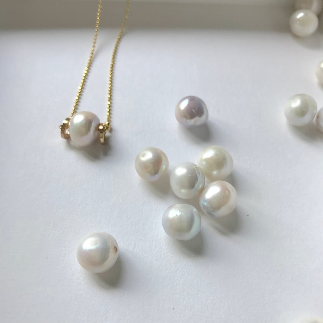 ・真珠(淡水パール)は全て形や色が微妙に異なりシワや歪みも個性のひとつです。それぞれの風合いをお楽しみいただければと思います。(写真1枚目参照)